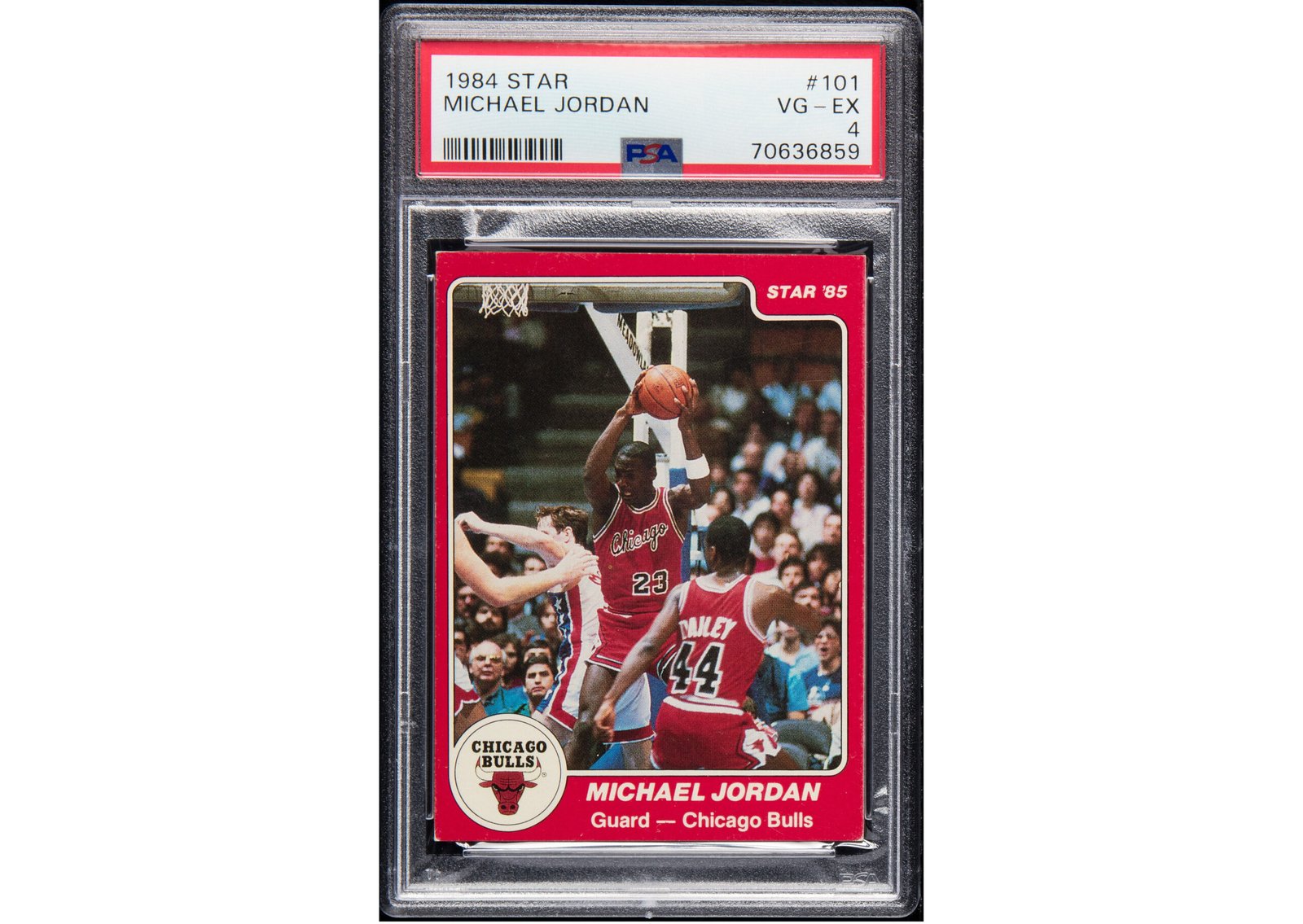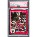 1984 Star Co. Michael Jordan #101 PSA VG-EX 4. The 1986 Fleer Jordan that serves as the most recognizable cardboard of the past half century is widely and properly filed under the header of “rookie,” but the offered relic predates that hobby essential, tracking back to the first days of His Airness on an NBA court. There are no professional statistics to be found on the back of this coveted rarity–only Tarheels tallies–and nothing but immortality ahead. And this isn’t just the older sibling of the Jordan rookie family, but a far rarer one to boot. These cards were originally distributed in sealed team bags with the Jordan on top, in a production run believed to have numbered below 5,000. Graded PSA VG-EX 4.