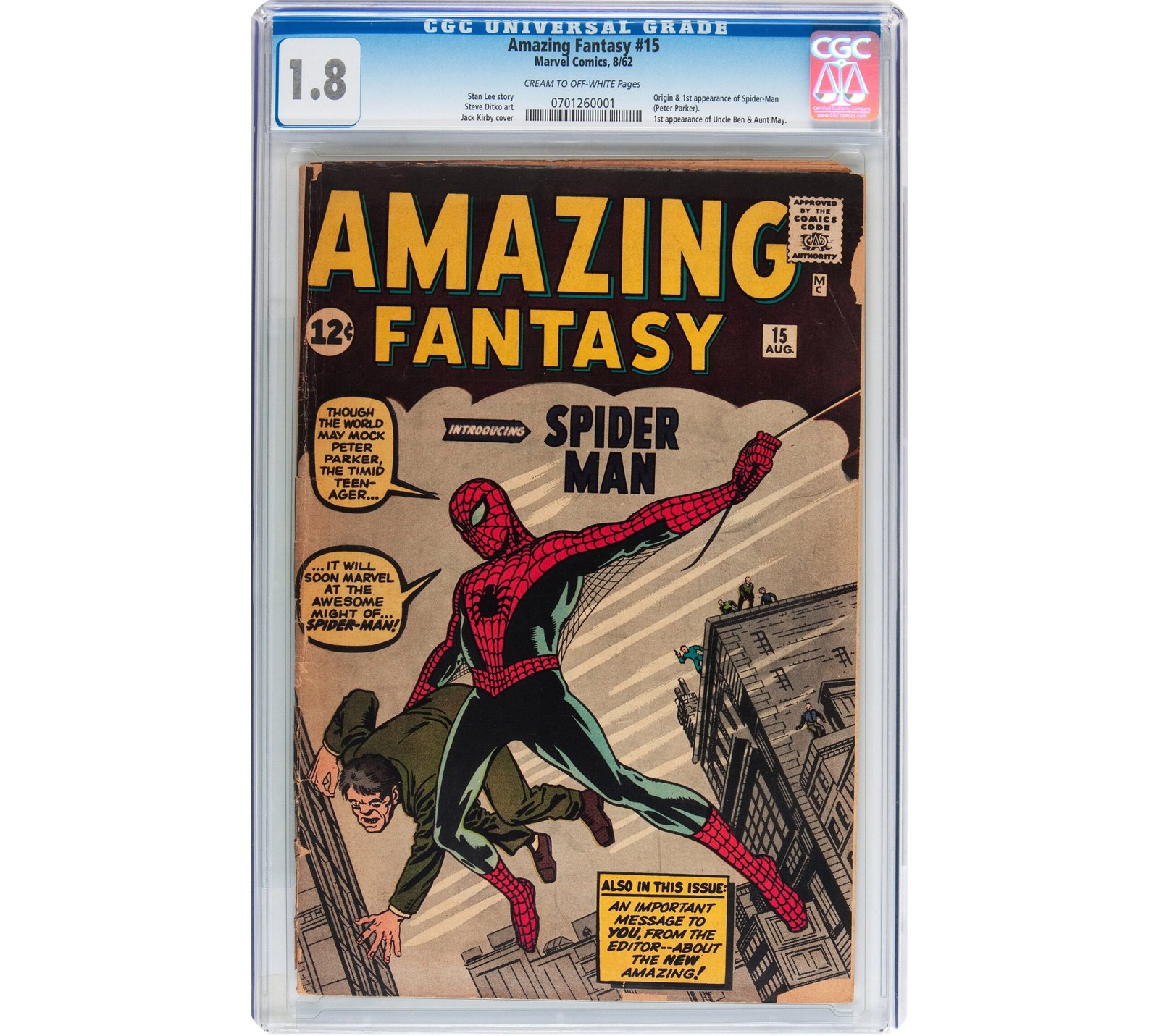 Amazing Fantasy #15 (Marvel, 1962) CGC GD- 1.8 Cream to off-white pages. The origin and first appearance of Spider-Man (Peter Parker) and the first appearances of Uncle Ben and Aunt May. Jack Kirby and Steve Ditko cover and art.