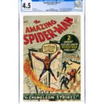 The Amazing Spider-Man #1 (Marvel, 1963) CGC VG+ 4.5 Off-white to white pages. Spider-Man’s origin is retold. First Fantastic Four crossover. First appearances of J. Jonah Jameson, John Jameson, and the Chameleon (who will appear in the upcoming Kraven the Hunter movie). Steve Ditko cover and art.