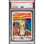 Pokémon Mimikyu #289 Sun & Moon Promos PSA Trading Card Game Gem Mint 10 (The Pokémon Company, 2018) Munch: A Retrospective Campaign. The iconic artwork by Edvard Munch, The Scream, received a little make over in 2018. Pokémon released a set of five cards with their characters recreating the famous painting in 2018 as promo cards from the Sun & Moon series. The card offered here features Mimikyu, with a dark figure in the background (Pikachu). The next card in the set is of Pikachu with another character behind him. PSA has certified 869 copies earning a Gem Mint 10.