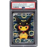 Pokémon Poncho-wearing Pikachu 231 XY & XY BREAK Promos PSA Trading Card Game Gem Mint 10 (The Pokémon Company, 2016) Shiny Rayquaza Poncho Pikachu Box. The card offered here is from the Rayquaza Poncho-Wearing Pikachu Special Box. As the name of the box might suggest, the card here features Pikachu wearing a Rayquaza poncho. Adorable! Please note that this is the “Shiny” version of the Rayquaza Poncho Pikachu card. The artwork is done by Kouki Saitou. PSA has certified 1,409 copies earning a Gem Mint 10 grade.