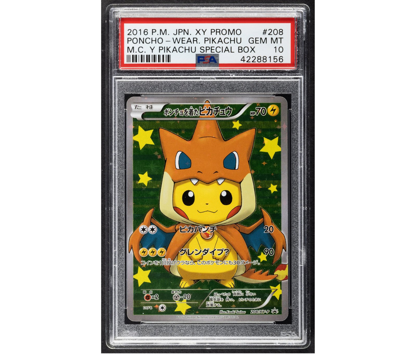 Pokémon Poncho-wearing Pikachu 208 XY & XY BREAK Promos PSA Trading Card Game Gem Mint 10 (The Pokémon Company, 2016) Mega Charizard Y Poncho-wearing Pikachu Box. Check this out! Fan-favorite Pikachu is sporting a poncho in the shape of another favorite, Charizard! This card came from a box that was part of a limited edition series sold in Pokémon Centers in Japan in January 2016. The series was so limited that they had a limit of 10 per customer! This specific version has Pikachu in a poncho designed after Mega Charizard Y. The artwork for this card was done by Kouki Saitou. PSA has certified 1,564 copies earning a Gem Mint 10 grade.