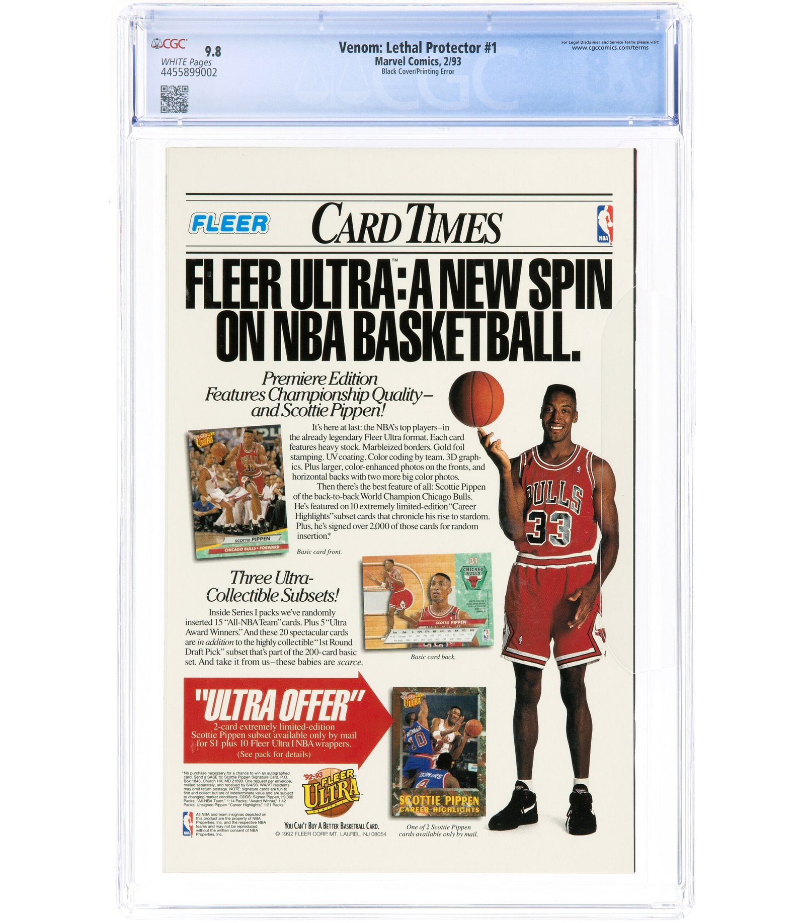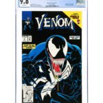 Venom: Lethal Protector #1 Black Cover Printing Error (Marvel, 1993) CGC NM/MT 9.8 White pages. Venom’s first solo title. This issue was supposed to have a red foil cover background, but a few copies were printed with a black background! To date 332 copies have been certified by CGC, and since counterfeits of this book do exist, a CGC-graded copy is important. Spider-Man appearance. Mark Bagley cover and art.